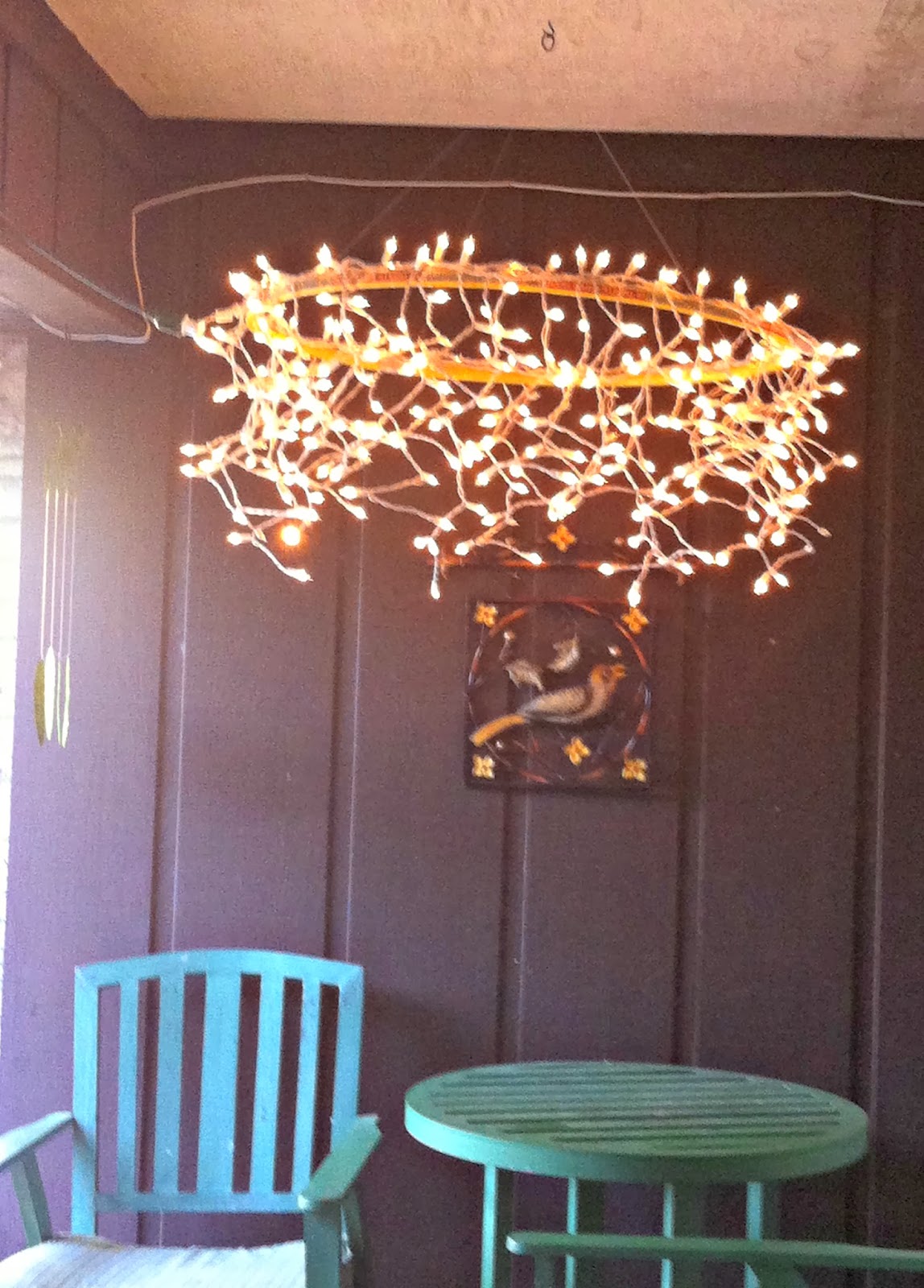 This is my Hula Hoop Chandelier Light, it cost me less than ten dollars to make. I love it!!